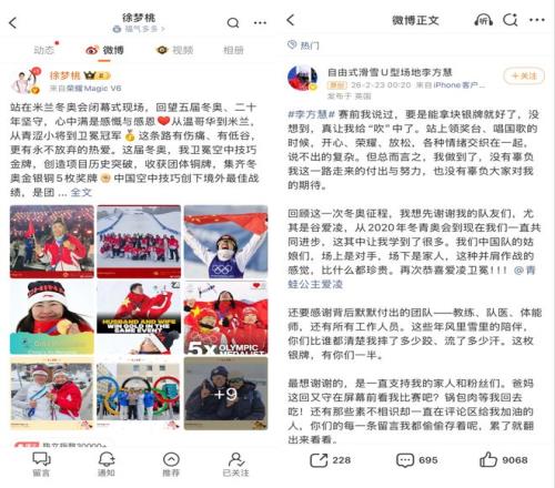 徐梦桃一直在分享训练日常、比赛感悟,李方慧也在赛后发文并感慨与谷爱凌之间的惺惺相惜,林孝埈、陈梦、孙颖莎等运动员,也均在持续更新内容。