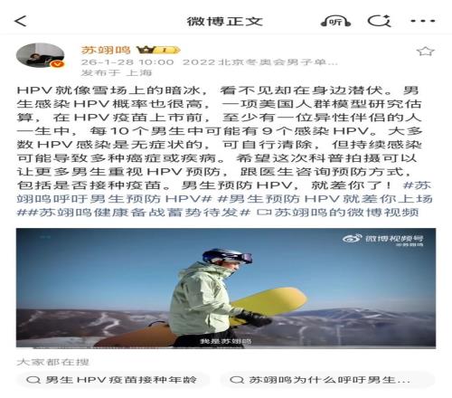 冬奥前夕,默沙东中国借势赛事热度,发布了“呼吁男生预防HPV”的公益科普项目,该话题自带的公共价值,加上苏翊鸣的热度爆发,引发了大量针对HPV预防的讨论和科普贴,有效提升了此次预防HPV的科普效果,该词条目前有2.6亿阅读量、7.3万讨论量。