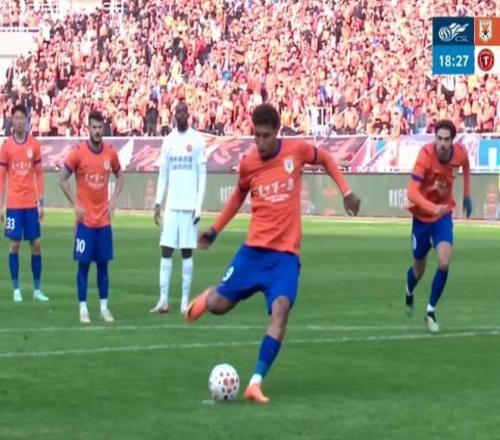 第18分钟,克雷桑禁区内被绊倒,裁判给了点球,随后亲自主罚命中,山东泰山2-0!
